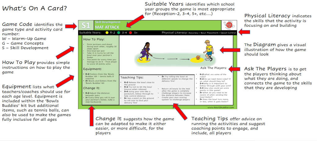 Bowls Buddies have produced a 30 page A4 Activity Book that is ideal for Schools, Sports Partnerships or Clubs that want to engage children. This is included with all our kits. An example of a game card, and what it contains, is shown below.